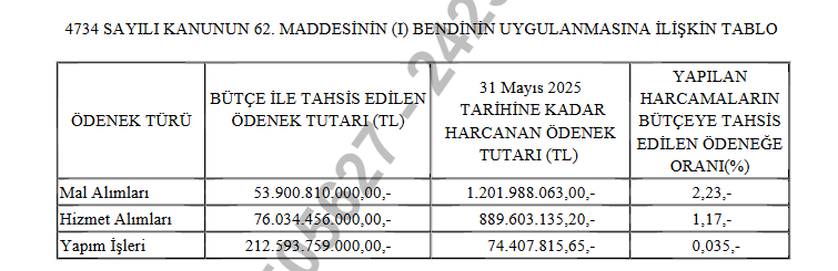 Kamu İhale Kurumu Genel Tebliğine göre, Bakanlığımız 2025 Mali Yılı Bütçesine mal, hizmet alımları ve yapım işleri için tahsis edilen ödenekler ile bu ödeneklerden 31 Mayıs 2025 tarihine kadar yapılan harcamalara ulaşmak için tıklayınız.